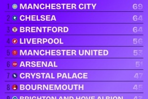 1、曼城:69次