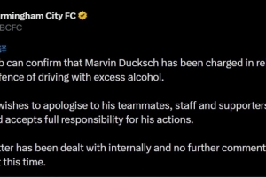 官方写道:“俱乐部确认,杜克施因涉嫌酒后驾车罪名被起诉。”