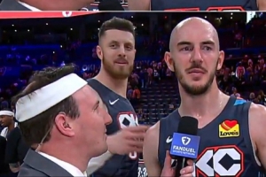 赛后雷霆球员卡鲁索在场边接受队记Nick Gallo的采访。哈尔滕施泰因过来整蛊队记,将卡鲁索的头戴摘下并套在Nick Gallo头上,发带秒变“绷带”。